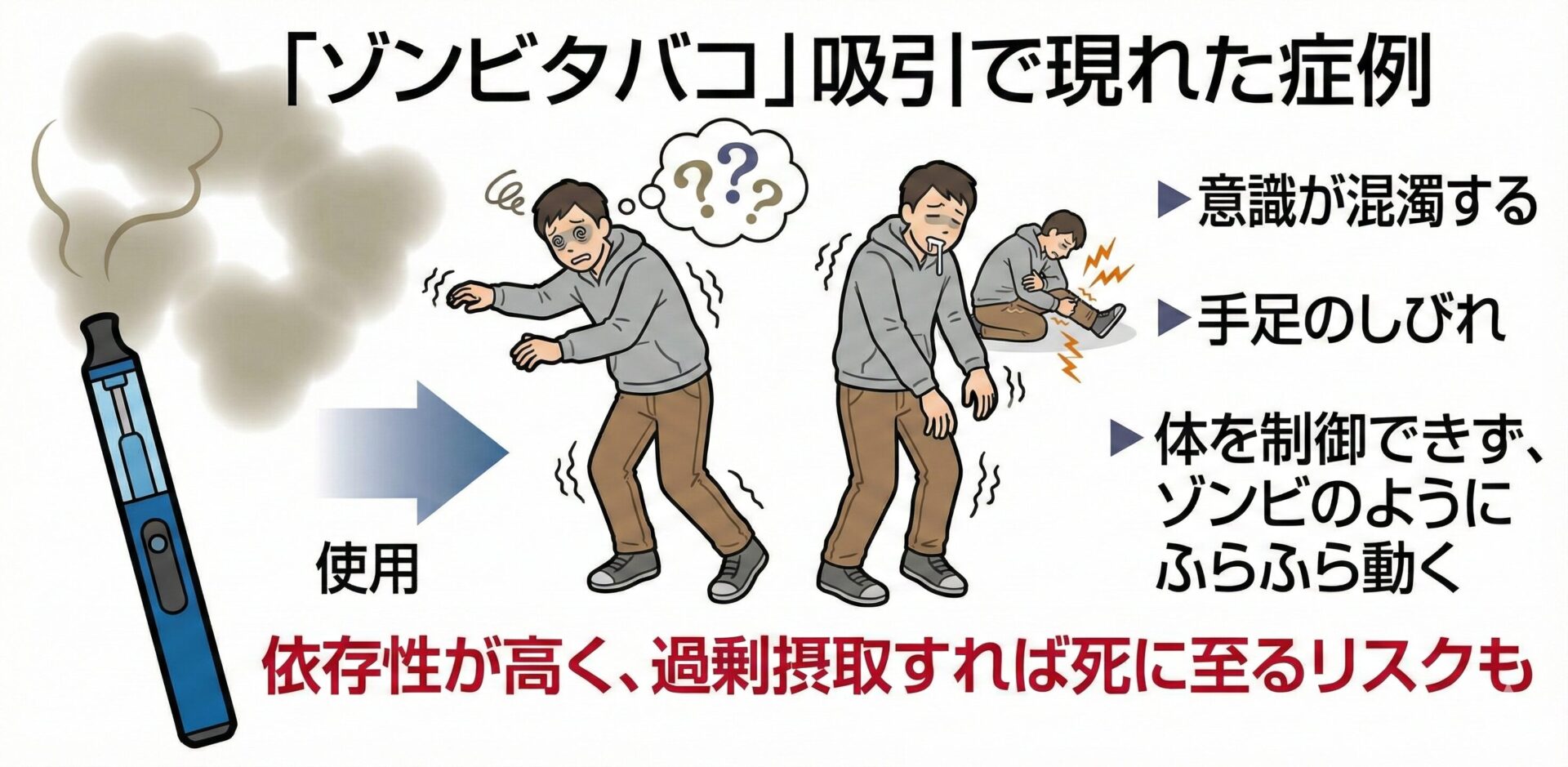 吸引すると、手足の震えやけいれん、意識喪失、幻覚などの症状が現れます。使用者がふらふらと街中を徘徊したり、奇妙な動きをしたりする様子から、海外やネット上で「ゾンビたばこ」という俗称が定着しました。