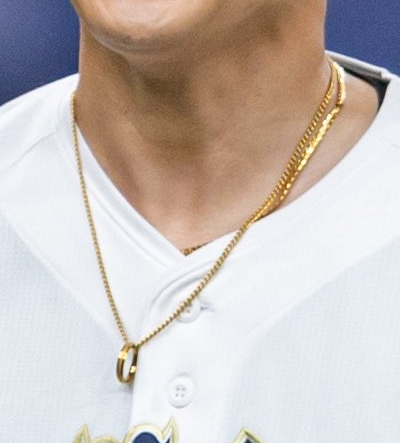 チームメイト・山崎颯一郎選手が結婚報告後に着用し始めたネックレスとビジュアル的に似ていますね。